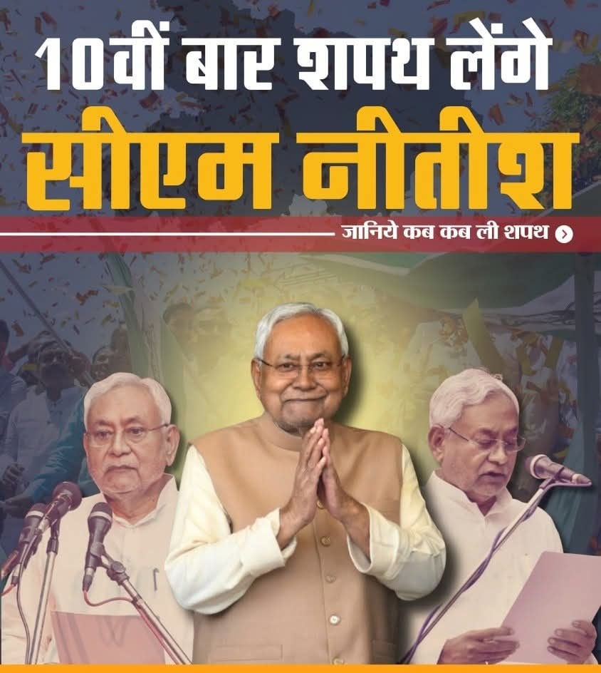 नीतीश कुमार बिहार के पहले ऐसे मुख्यमंत्री बन चुके हैं जिसने 10 बार इस पद की शपथ ली हो। साथ ही वह बिहार में सबसे लंबे समय पर सत्ता पर रहने वाले सीएम बन चुके हैं।